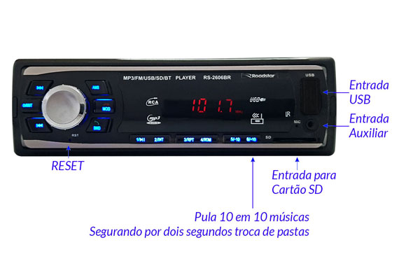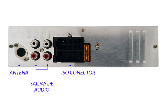 O auto rádio RS-2606BR possui entrada frontal auxiliar, entrada frontal para cartão micro SD, entrada frontal USB, conexão Bluetooth, 4 saídas RCA e saída com conector ISO.
